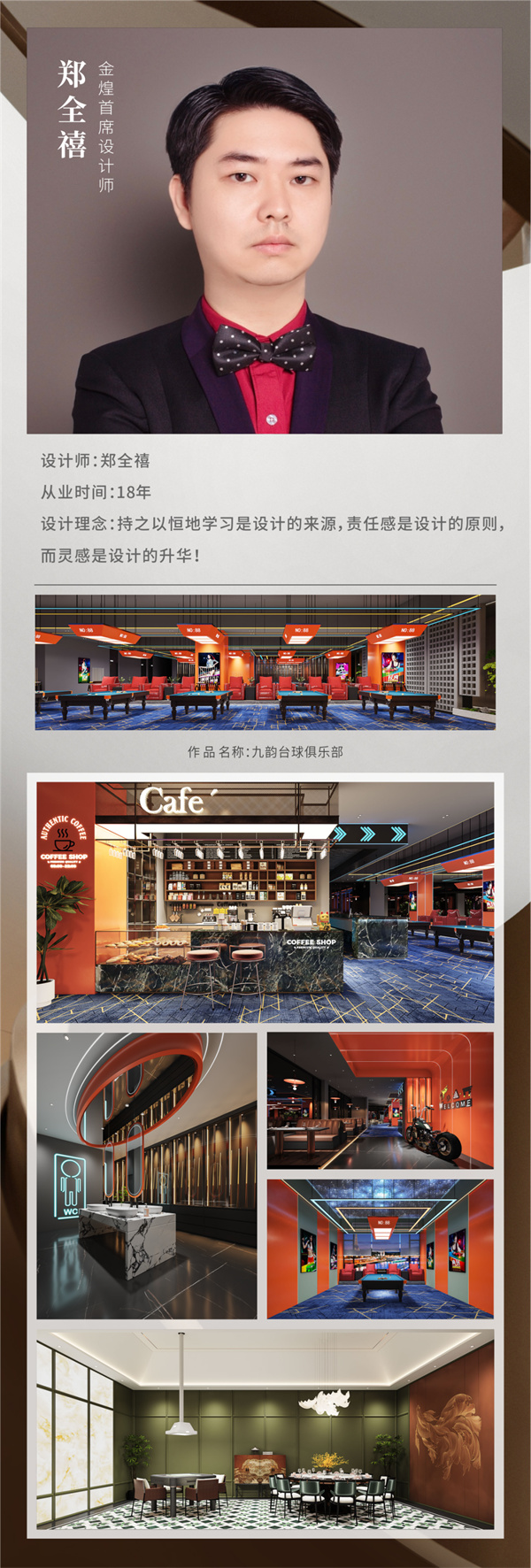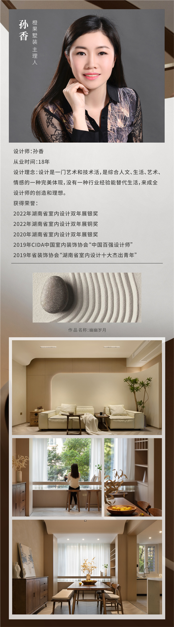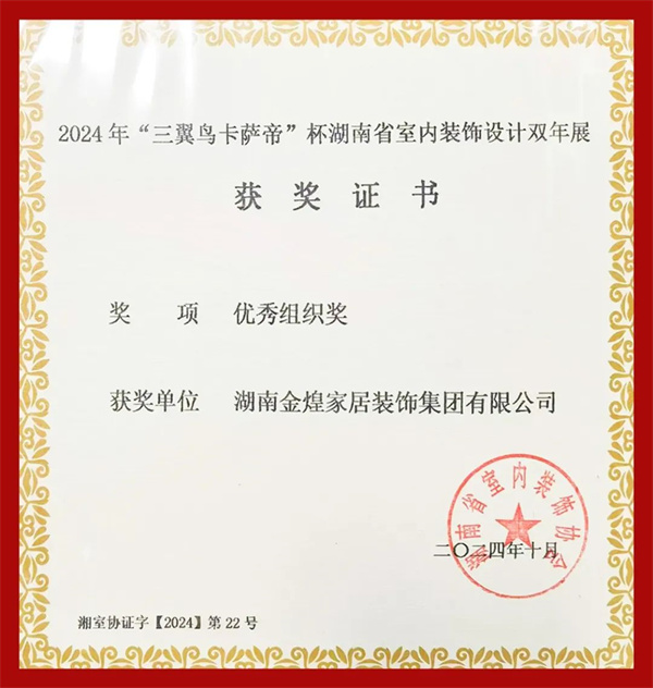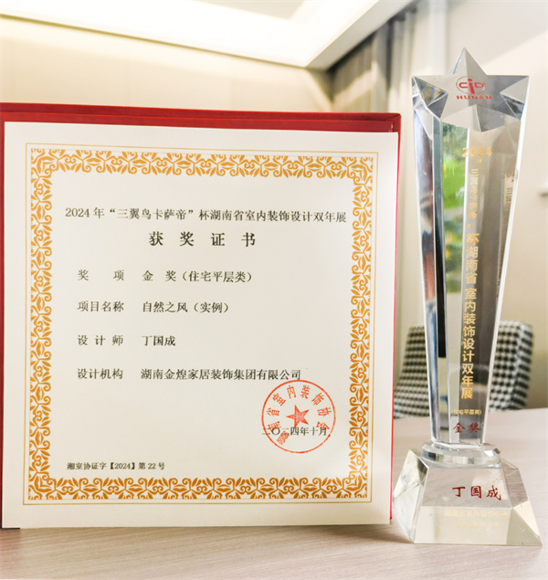 本次大賽以“綠色瀟湘·幸福湖南”為主題,金煌設計總監丁國成設計的住宅項目《自然之風》,金煌TOP設計院孫潔設計的麓云國際別墅項目獲得金獎;金煌首席設計師鄭全禧設計的會所項目九韻臺球俱樂部獲得銅獎;孫潔設計的住宅項目《映?槿》獲得優秀獎。橙果墅裝主理人孫香設計的住宅項目《幽幽歲月》獲得金獎,《明暗至簡》獲得銅獎。金煌也喜獲優秀組織獎。