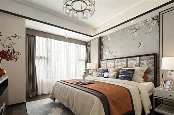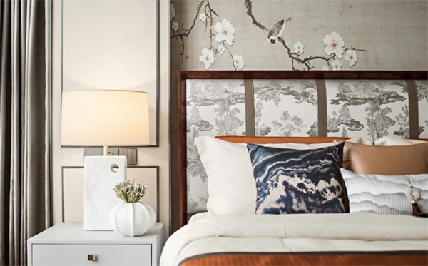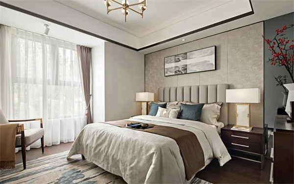 臥室的色彩以柔和、舒適的中性色為主,營造出寧靜、放松的氛圍。床頭做了大塊裝飾背景,再搭配溫馨質(zhì)感有格調(diào)的軟裝布置,拉開空間的層次感。