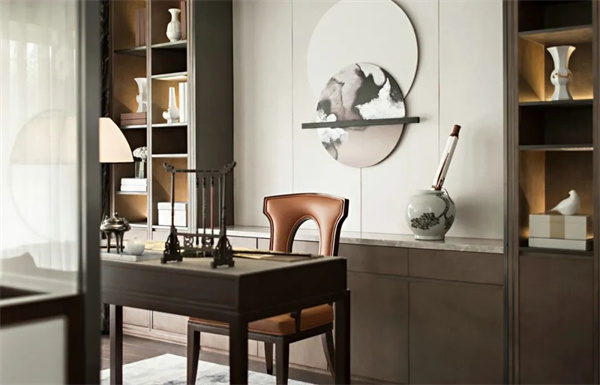 書桌和書柜是書房的核心裝置,沉穩(wěn)的木質(zhì)書桌與原木書柜展示了東方文化的深厚底蘊(yùn)。書桌上的文房四寶、書柜上的古典書畫和瓷器既點(diǎn)綴了空間,又表達(dá)了主人對傳統(tǒng)文化的熱愛。