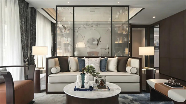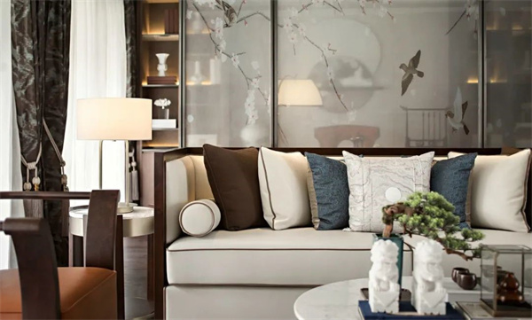沙發(fā)墻在硬包基礎(chǔ)上加入詩意背景畫面,搭配新中式的沙發(fā),側(cè)邊配上坐椅、盆栽綠植的布置,使得整個客廳充滿著儒雅端莊的氛圍氣息。