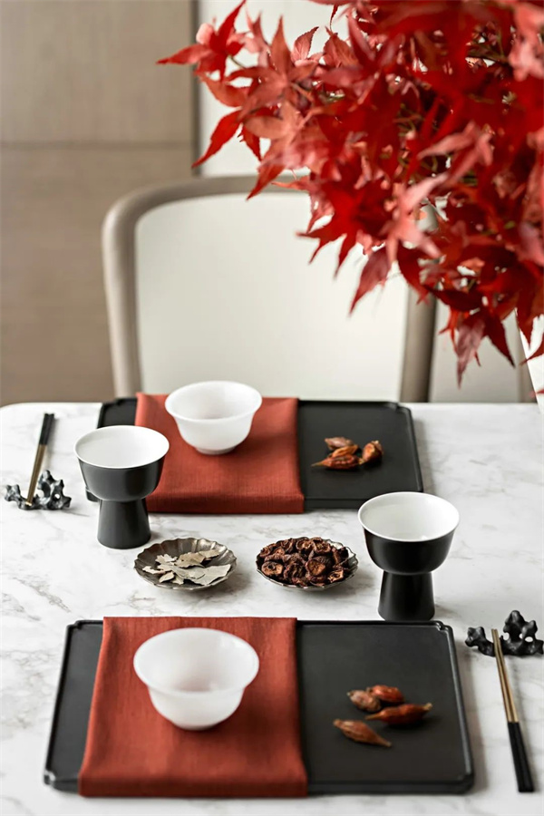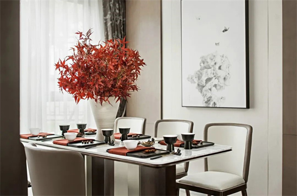 新中式餐廳布置,以天然材料的運(yùn)用、色彩搭配的細(xì)致處理以及家具的精心選擇,使餐廳呈現(xiàn)出舒適、高品質(zhì)的用餐環(huán)境。背景墻上掛上一幅古韻山水畫,增加空間質(zhì)感,充滿了禪意的韻味。