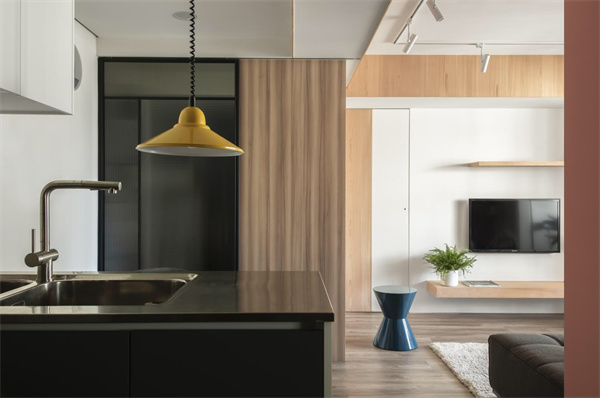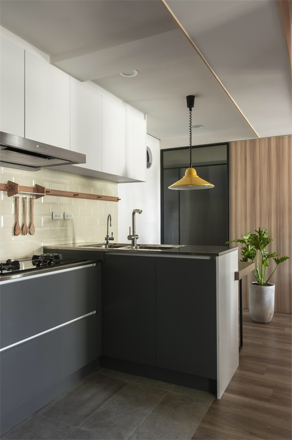為節約空間,廚房采用半開放式設計,各種廚具和儲物空間布局合理,白色吊柜搭配深色櫥柜,形成鮮明的對比,既簡約又富有層次感。大面積的臺面空間提供充足的操作空間,更融合了家庭生活的溫馨和舒適,在烹飪和用餐中盡情享受家的溫暖。