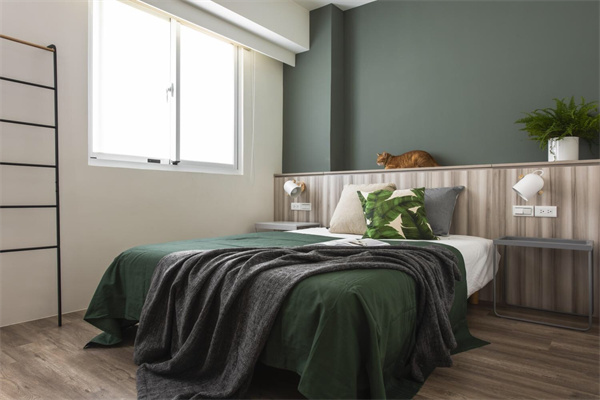 深綠色背景墻為房間增添了一抹生機和深度,仿佛將自然的寧靜引入室內。大窗戶將充足的自然光線引入室內,使空間明亮而通透,同時與室外的美景相連,享受愜意美好居家生活。