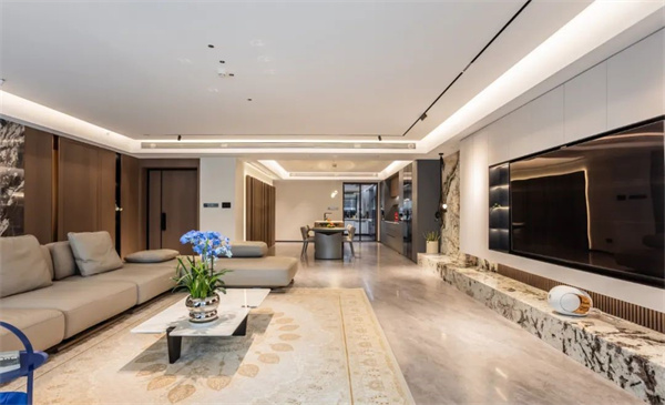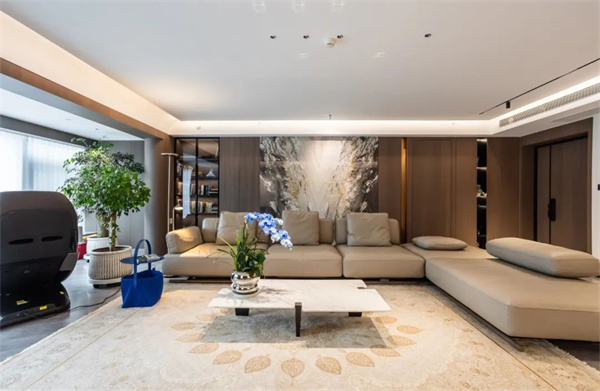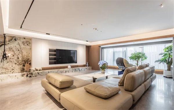 意式輕奢客廳以豪華和舒適為特點(diǎn),注重細(xì)節(jié)和藝術(shù)品味。大理石地磚和墻壁飾面營造出高貴的氛圍,與暖色調(diào)的墻壁相得益彰。