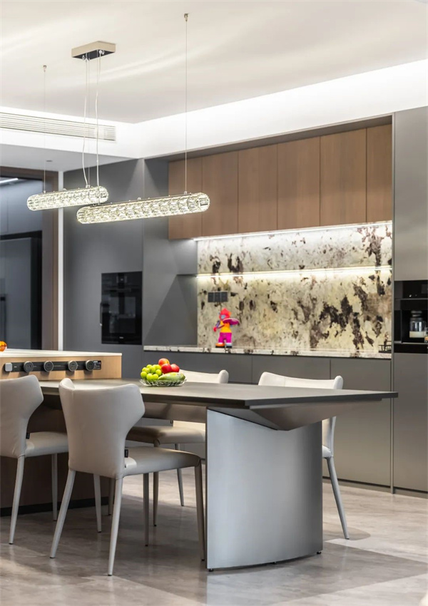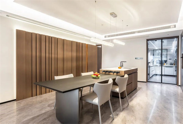 意式輕奢餐廳強(qiáng)調(diào)用餐空間的舒適和尊貴感?,F(xiàn)代風(fēng)格餐桌和餐椅搭配島臺,加上一側(cè)的定制酒柜,錯(cuò)落有致地?cái)[放著各式美酒與精致酒杯,打造出一個(gè)與家人和朋友共享美食的完美場所。