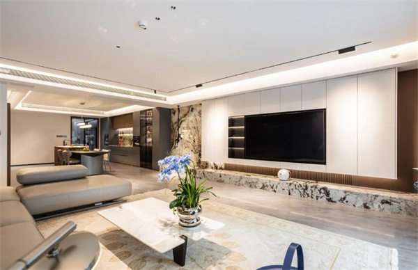 客廳簡潔干凈的布置,溫潤、素雅且低飽和度的色彩搭配,讓整個(gè)空間充滿高級的溫柔感。