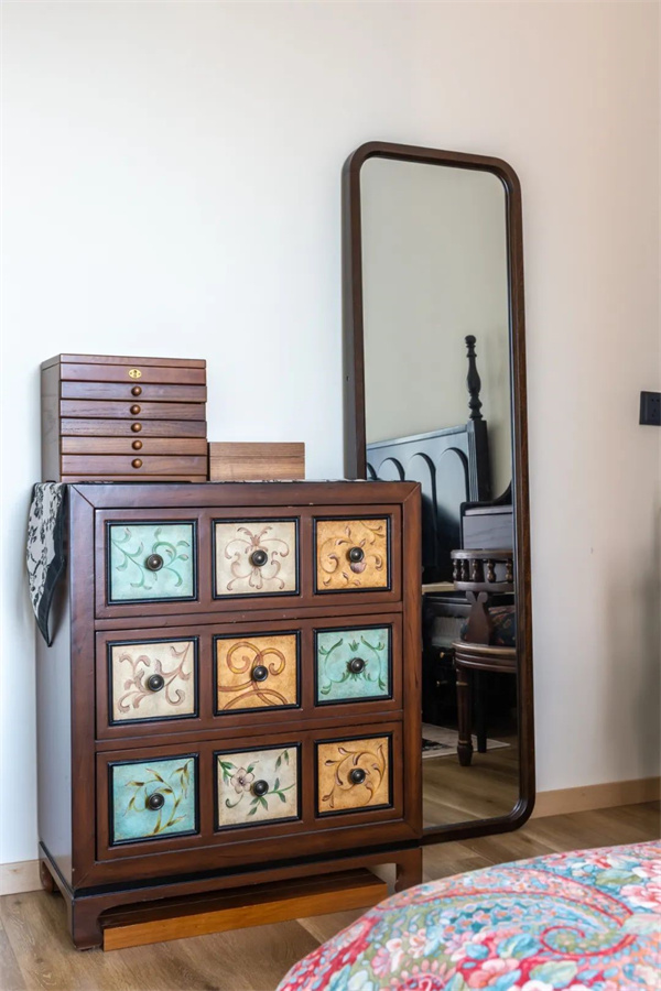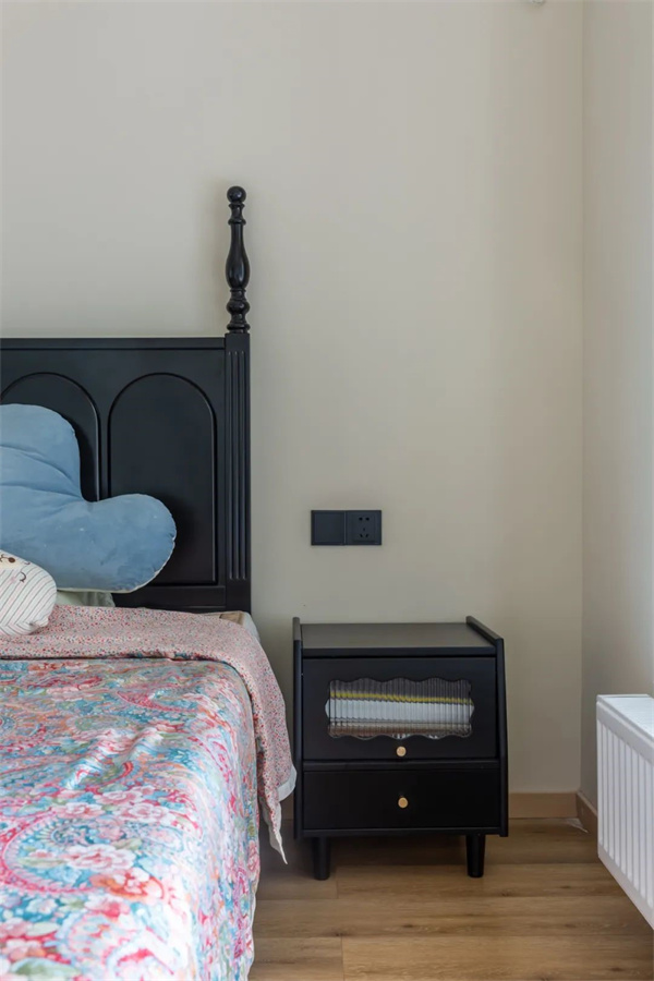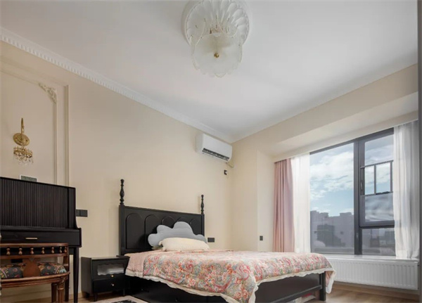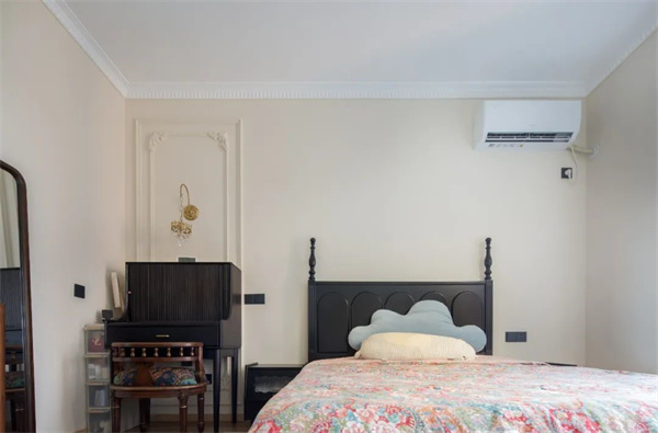 主臥延續(xù)了整體的色系搭配法則,大面積奶油色調(diào)讓整個(gè)空間看起來復(fù)古又慵懶。背景墻搭配了款式簡約的石膏線條,恰到好處地增添了精致感。床頭一角的實(shí)木梳妝臺(tái)形如小鋼琴,輕盈靈動(dòng),靜置角落裝點(diǎn)臥室,每一處細(xì)節(jié)都充滿法式的浪漫與優(yōu)雅。