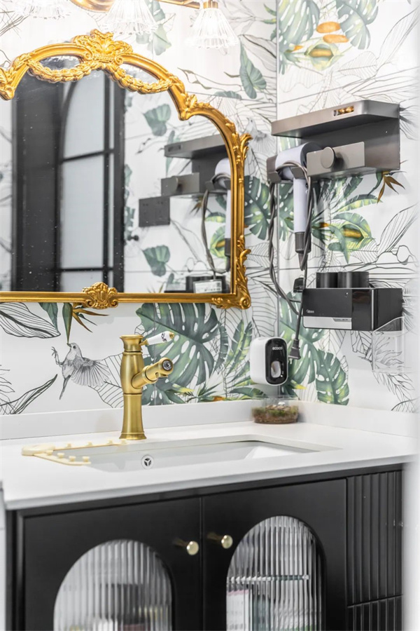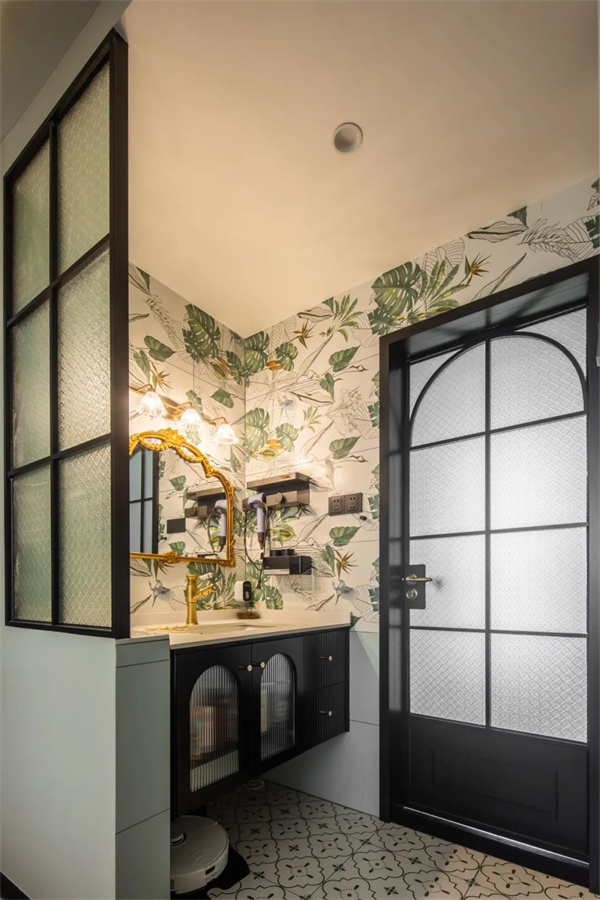 為提高空間利用率,衛(wèi)生間做了干濕分離設(shè)計(jì)。洗手臺(tái)墻面為大面積橙色,在復(fù)古壁燈的襯托下看起來格外溫馨。黑色定制柜造型簡約,與墻面形成鮮明對(duì)比,整個(gè)空間更加優(yōu)雅復(fù)古。
