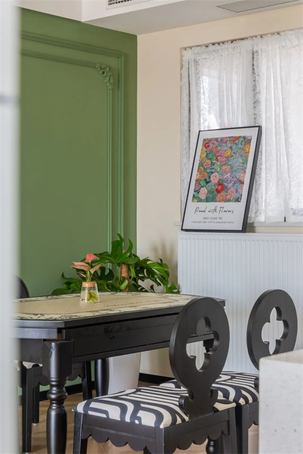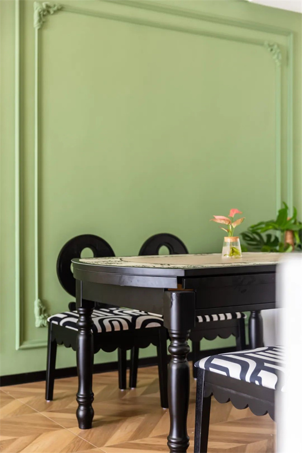 餐廳考慮到收納需求,定制了整排收納柜,承擔(dān)了收納+餐邊柜功能。原木餐桌搭配復(fù)古吊燈,營造出自然溫馨的就餐環(huán)境。背景墻整面做綠色裝飾,與白墻和黑色的餐桌椅組合,彰顯出自由、靈動(dòng)的美學(xué)意蘊(yùn)。