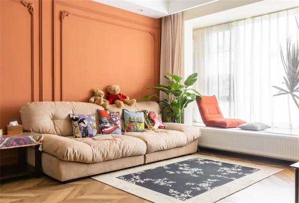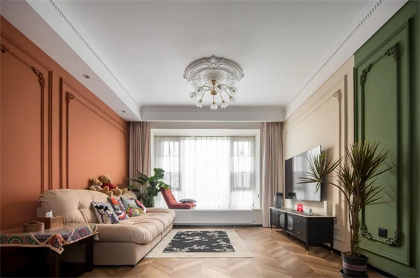 客廳主色調(diào)是溫柔的奶油色,搭配上質(zhì)地柔軟的沙發(fā),整個(gè)空間柔和又浪漫。墻面用石膏線做裝飾,打破白墻的單調(diào)空洞,增加藝術(shù)感。陽光透過寬大的窗戶灑入房間照映在綠植上,為空間賦予了自然氣息。