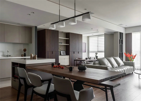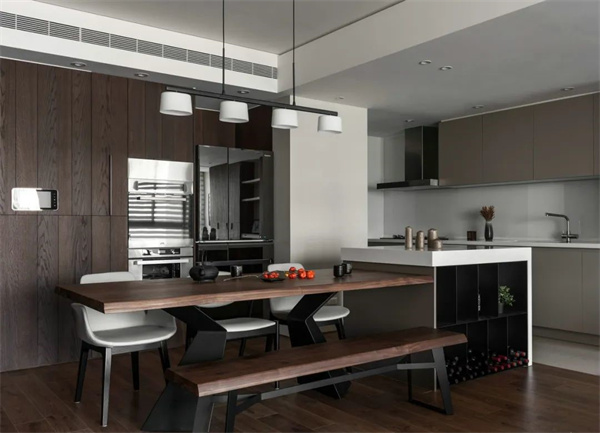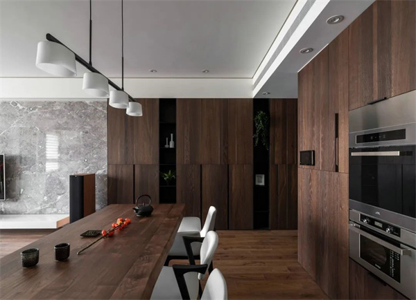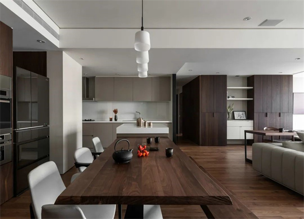 餐廳與客廳無縫相連,采用開放式布局。餐桌上擺放著精致的茶具和飾品,為餐區(qū)注入了活力和色彩。全原木色調(diào)的餐桌和定制柜與客廳保持一致的現(xiàn)代風(fēng)格格調(diào),配合嵌入式電器,整個(gè)空間顯得簡約現(xiàn)代而大方優(yōu)雅。