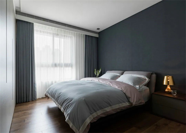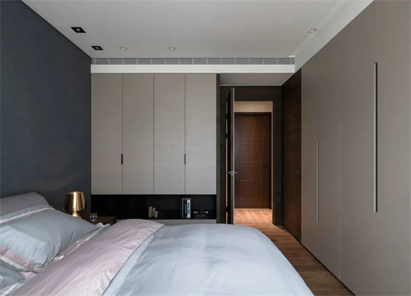 主臥室延續(xù)了整體的極簡風(fēng)格,以原木色和灰白色的搭配為主,消除了多余的裝飾元素。白色的定制柜和藍(lán)灰色的床品為臥室注入了寧靜的舒適感。通過精心設(shè)計(jì)的照明,讓空間充滿質(zhì)感和設(shè)計(jì)感。
