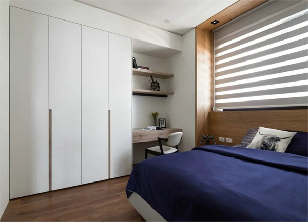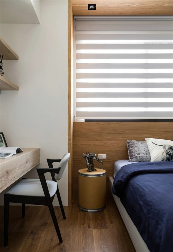 兒童房的書桌與定制柜采用一體化定制設(shè)計(jì)。軟裝上使用柔和的藍(lán)白組合作主導(dǎo)色調(diào),搭配原木色家具,保留了童真的活潑感,同時(shí)呈現(xiàn)現(xiàn)代簡約設(shè)計(jì)理念,為房間注入生氣和活力。