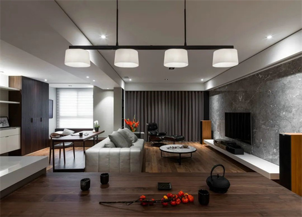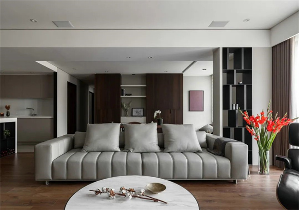 客廳墻面以白色為主,搭配原木色地板,突顯簡約與明亮。中性色調(diào)的大型沙發(fā)配以柔軟的抱枕,為家人和朋友提供了極致的舒適。空間點(diǎn)綴的綠植和插花,加上一組現(xiàn)代吊燈提供了柔和而溫暖的光線,增添了空間的品味感。