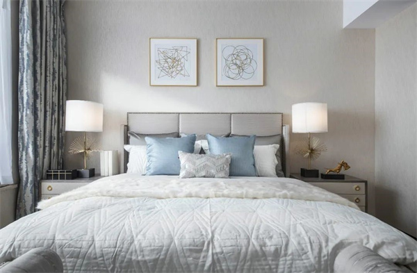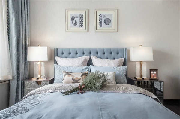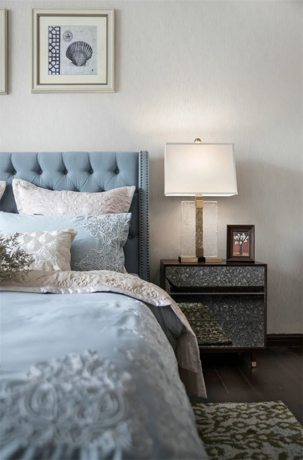 主臥中,優(yōu)雅與奢華交織成了一幅夢(mèng)幻的畫(huà)卷。房間的主色調(diào)為柔和的米白色和天藍(lán)色,床頭采用軟包設(shè)計(jì),床上鋪設(shè)著絲綢質(zhì)地的天藍(lán)色床品,柔軟而光滑的觸感讓人沉醉其中,與花卉相互輝映,彰顯出典雅與細(xì)膩。