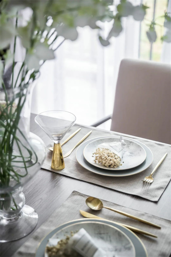 餐廳以淺色為主調(diào),中央擺放著一張長(zhǎng)方形仿木質(zhì)紋理的餐桌,桌面光滑細(xì)膩,散發(fā)出低調(diào)的奢華感。上方懸掛著一盞華麗的水晶吊燈,搭配桌上精心布置的金色餐具、細(xì)瓷餐盤以及充滿自然氣息的鮮花,營(yíng)造出溫馨而浪漫的用餐氛圍。