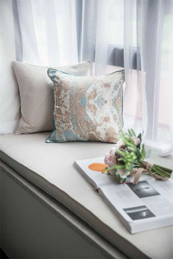次臥以柔和的淺灰色和象牙白為主色調(diào)。床上鋪設(shè)著柔軟的棉麻床品,搭配著幾只絲綢抱枕,帶來(lái)舒適而奢華的觸感。大窗戶配有輕紗窗簾和厚重的絨布窗簾,既能保證充足的光線,又能在需要時(shí)提供私密性。