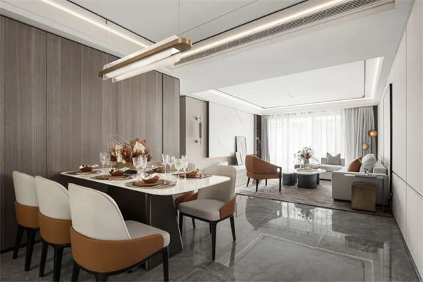 在客廳的設計中,采用簡約的家具和裝飾品,搭配簡約風格的藝術裝飾和照明燈具,選擇中性色調和柔和的色彩搭配,營造出輕松宜人的氛圍。同時,充分利用空間,確保流線型布局,使客廳顯得更加開闊和通透。