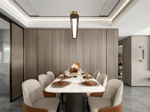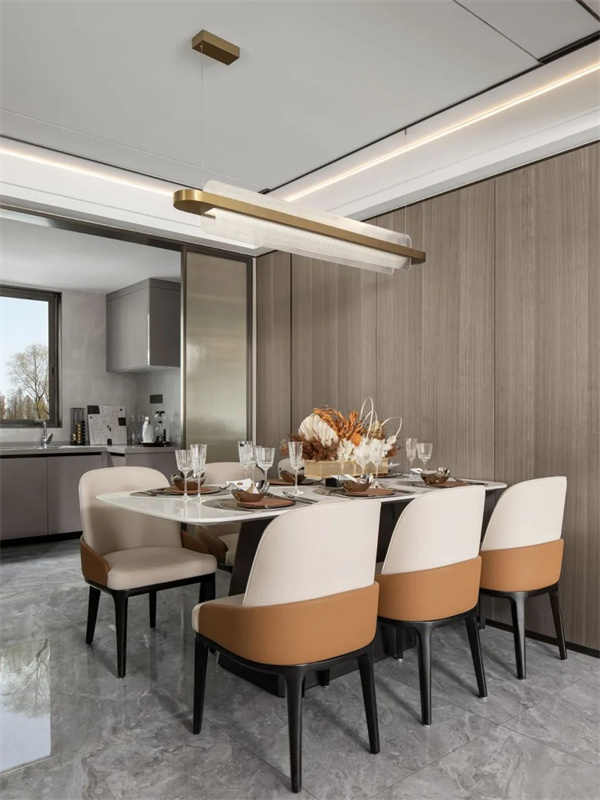 餐廳空間與客廳相連貫,整體寬度充足,居中擺放一套簡約巖板餐桌+舒適的皮藝餐椅,讓用餐氛圍輕松閑適。餐桌上的插花和素雅的餐具恰到好處地點綴著整體設計,既保留了簡約的美感,又增添了一抹生機和活力。