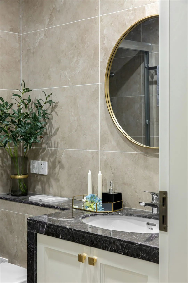 衛生間以淺色大理石瓷磚裝飾,金屬邊框的鏡面與精致的洗漱臺相映成趣,在燈光的映襯下透出高級感。玻璃淋浴隔斷,讓空間更顯通透,打造出一個舒適放松的洗浴空間。