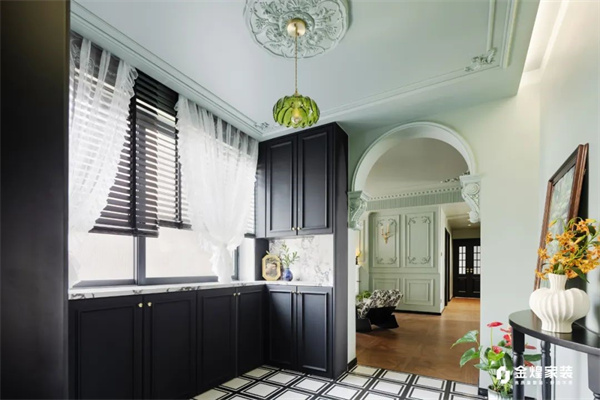 櫥柜采用全定制化設計,柜門搭配精致的黃銅拉手,彰顯出古老的復古風格。自然光透過窗戶灑入,使整個空間更加通透明亮。現代化的廚具隱藏在復古風格的櫥柜中,既保留了設計的純粹性,又確保了現代烹飪的便捷性,仿佛在這個空間中,法式復古的優雅與生活和諧共生。