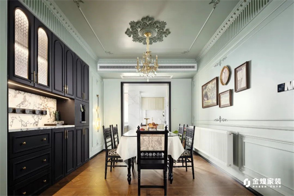 餐廳考慮到收納需求,定制了整排收納柜,承擔了收納+餐邊柜功能。精致的餐桌椅,以柔和的廓形和雕花細節彰顯出優雅的風格。裝飾畫的復古圖案和金色鏡框為空間增添一絲藝術氛圍,讓每一餐都宛如置身法式古典宮殿般,充滿儀式感與浪漫情調。