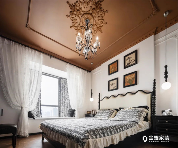 主臥延續了整體的色系搭配法則,大面積巧克力色墻頂搭配精致的空中吊燈,讓整個空間看起來復古又慵懶。背景墻采用款式簡約的石膏線條,恰到好處地增添了精致感。精致的軟裝布置,讓每個角落都融入高貴與溫暖,仿佛置身于巴黎的浪漫宮廷。